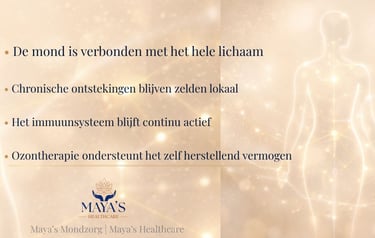 Bij aanhoudende ontstekingen kijk ik niet alleen naar de mond, maar ook naar onderliggende factoren die het herstel beïnvloeden. Hierbij combineer ik gespecialiseerde mondzorg met aanvullende ondersteuning, zoals ozontherapie en leefstijladvies.
